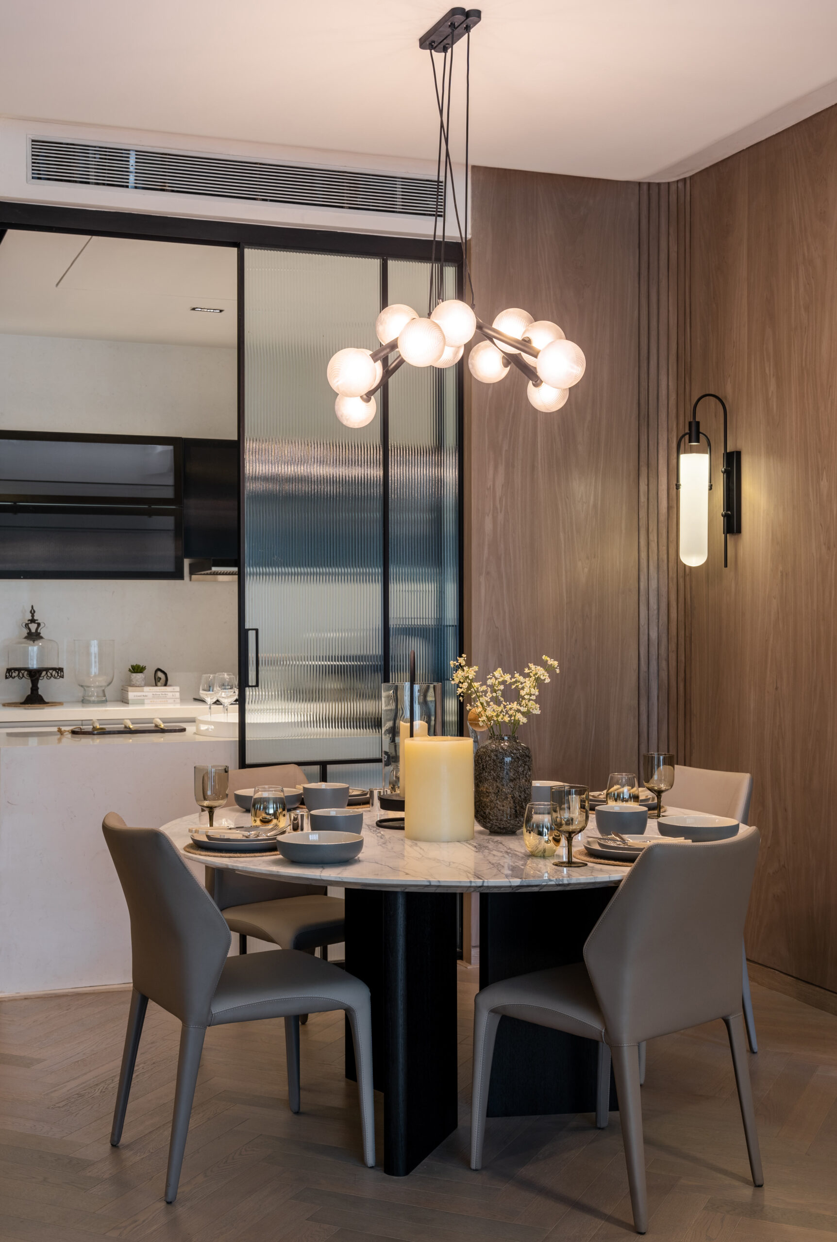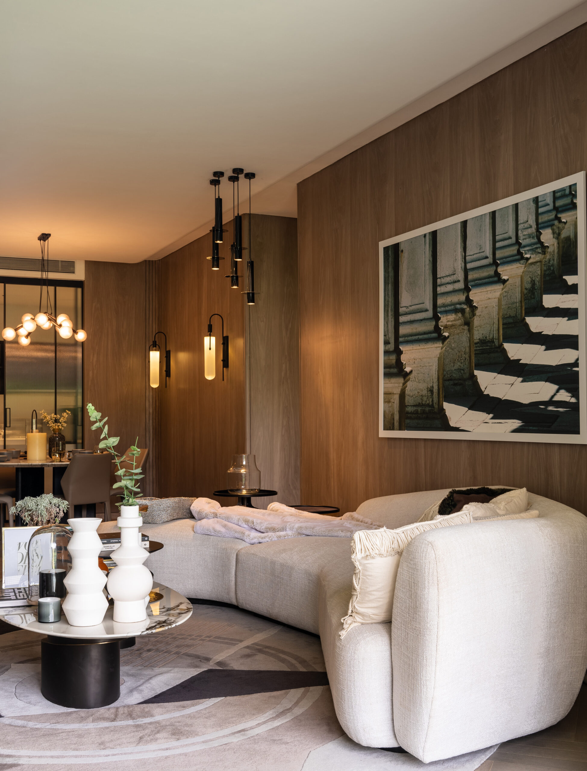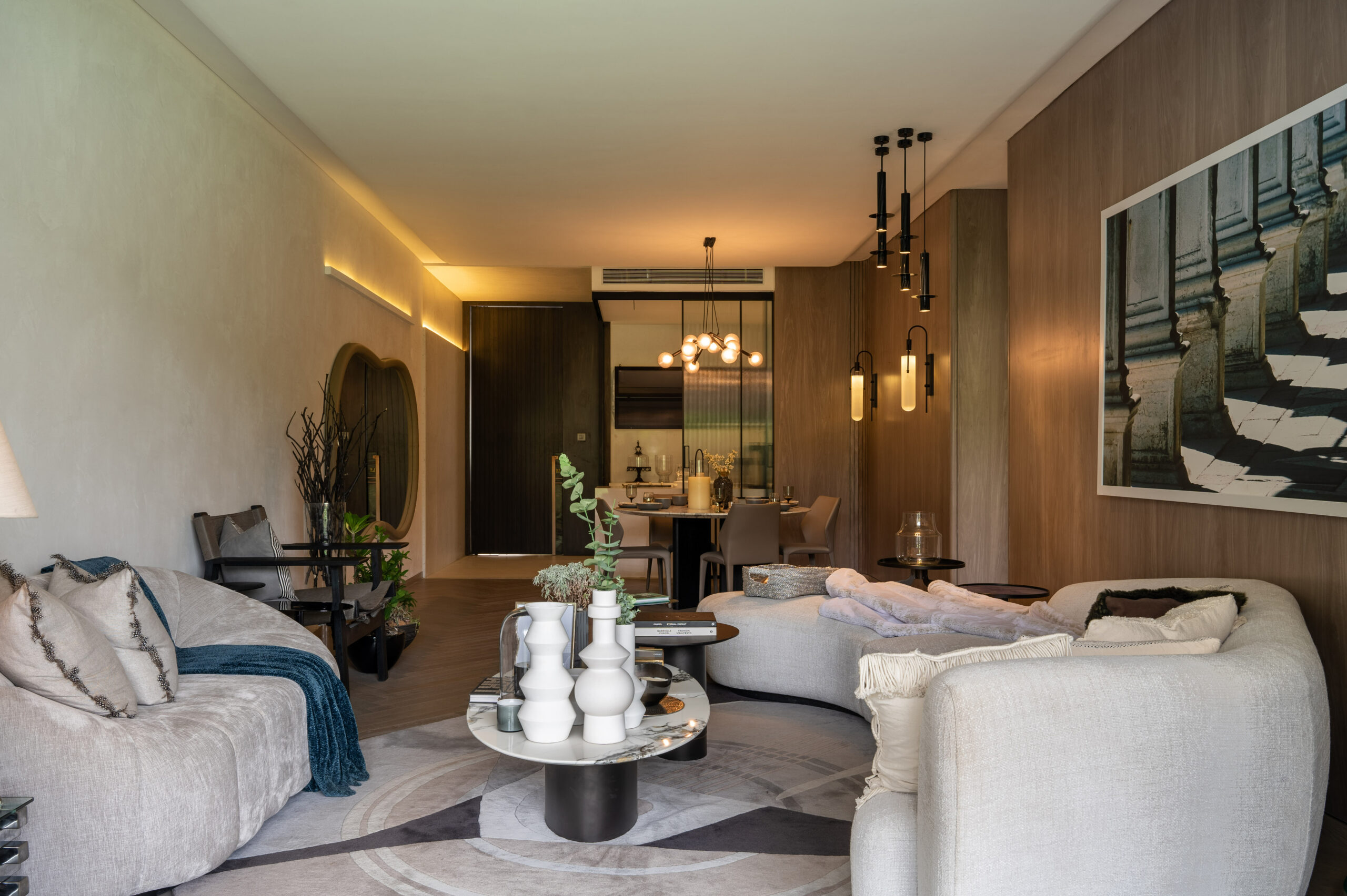 A high-rise apartment uniquely displays the luxury modern life style of the metro. Inspired by todays modernity the space is created with minimal and natural materials, soft textures, combined with curvilinear furniture forms which reflects in the seating, tables, mirrors and art. The colour palette features multiple shades of whites, with hues of sea salt, patterned wooden flooring and unique conceptual lighting features define “quite luxury” in all aspects of our design.