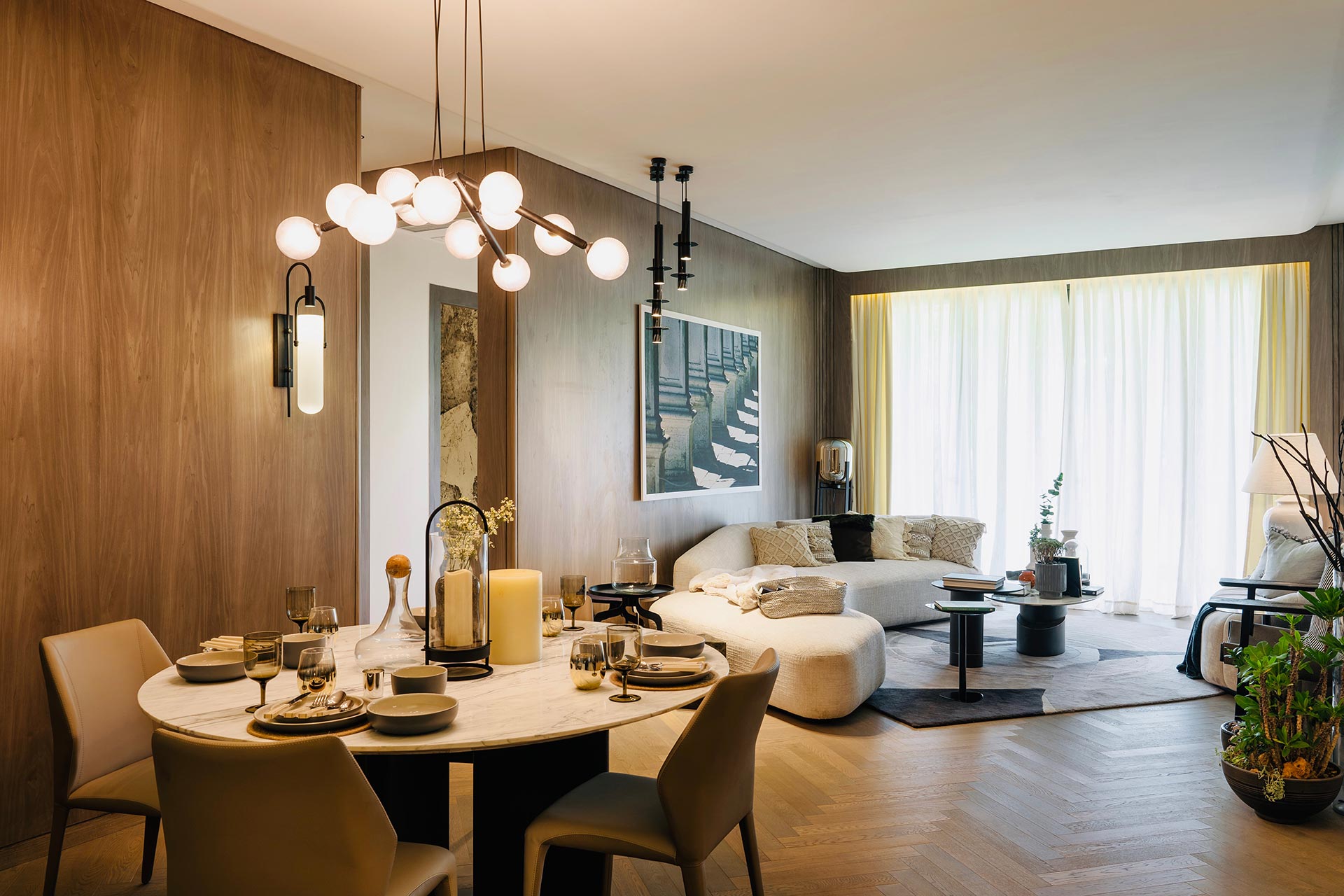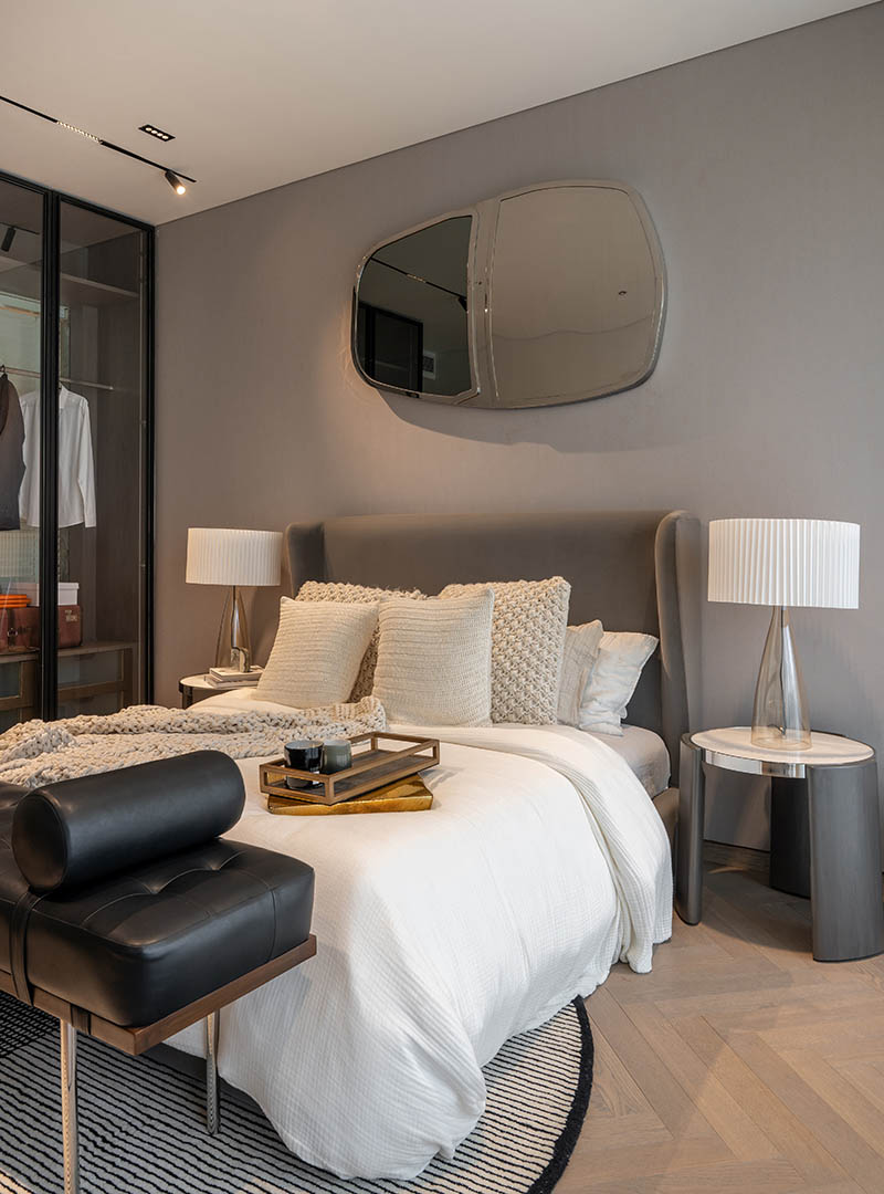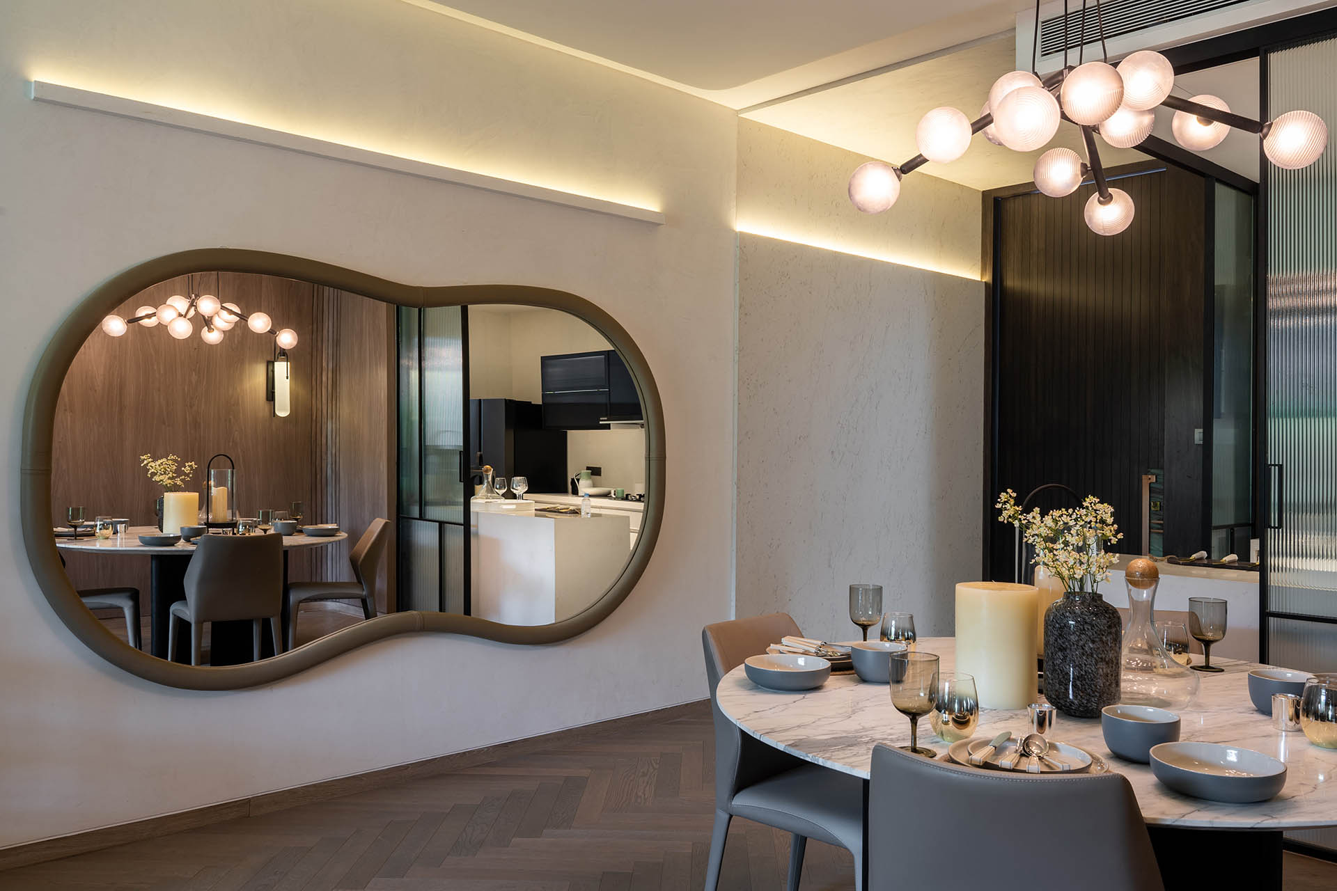 A high-rise apartment uniquely displays the luxury modern life style of the metro. Inspired by todays modernity the space is created with minimal and natural materials, soft textures, combined with curvilinear furniture forms which reflects in the seating, tables, mirrors and art. The colour palette features multiple shades of whites, with hues of sea salt, patterned wooden flooring and unique conceptual lighting features define “quite luxury” in all aspects of our design.